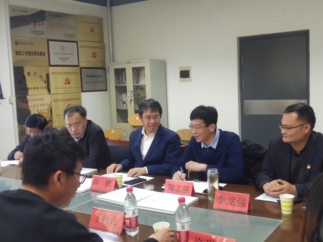 12月16日下午,集團(tuán)董事長薛鵬拜訪青島理工大學(xué),與馬克思主義學(xué)院王菁華書記、理工大學(xué)合作發(fā)展處鞠志強(qiáng)處長、馬克思主義學(xué)院李龍強(qiáng)副院長、沙洪成教授、劉先勇高級講師、合作發(fā)展處張?zhí)靷ダ蠋煹染托F髴?zhàn)略合作進(jìn)行了溝通、洽談。